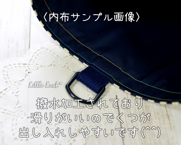 シューズバッグは内布に撥水布を用い、汚れた靴を入れても表に響きづらくしています。